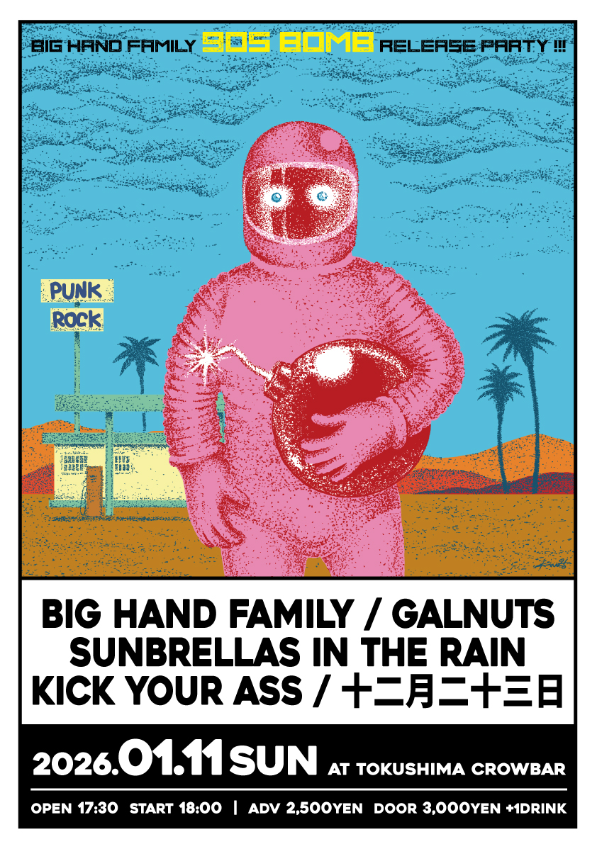 1/11日2026年 BIG HAND FAMILY 90S BOMB RELEASE PARTY BIG HAND FAMILY GALNUTS SUNBRELLAS IN THE RAIN KICK YOUR ASS 十二月二十三日 ADV2,500yen (+1d)Door3,000yen (+1d)open17:30start18:00※終了済のイベントです。